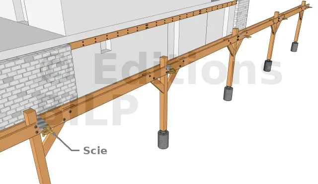 Comme les poteaux ont été posés sans les coupes, il faut maintenant les étêter à ras des poutres porteuses. Pour finir, il faudra protéger le bout contre l’humidité stagnante.