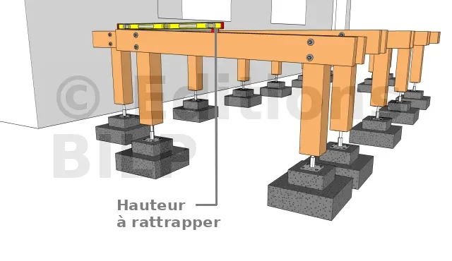 Les illustrations suivantes montrent l’avantage de l’utilisation des pieds de poteaux réglables de type PPRC pour la mise en oeuvre d’une terrasse en bois :