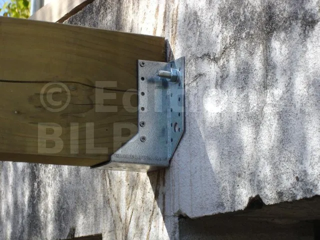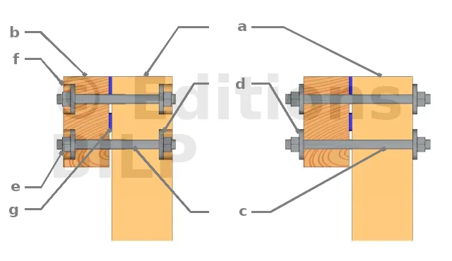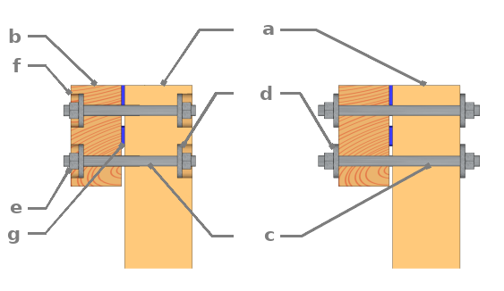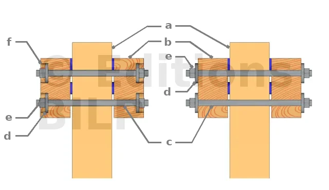 Afin de créer une ventilation et éviter la stagnation de l’eau entre la poutre et le poteau pour ne pas accélérer le pourrissement du bois, il est important d’y créer un petit espace de 5 à 10 mm par l’intermédiaire de cales larges à charge lourde, des rondelles ou des écrous.
