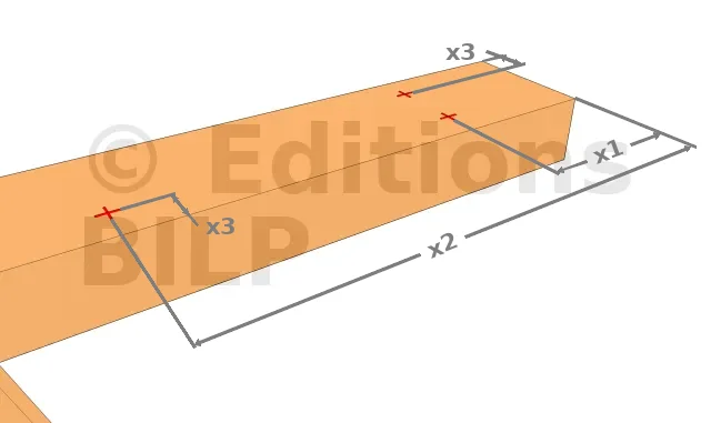 Cette étape suppose l’utilisation de boulon pour fixer les bras de contreventement. A partir des deux bouts de la poutre, faites des repères aux distances x1, x2 et x3. Elles correspondent respectivement à la distance du centre du trou de fixation aux poteaux par rapport aux bouts de la poutre, à la distance du centre du trou de fixation des bras de contreventement et au décalage du centre du trou par rapport aux côtés de la poutre.