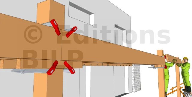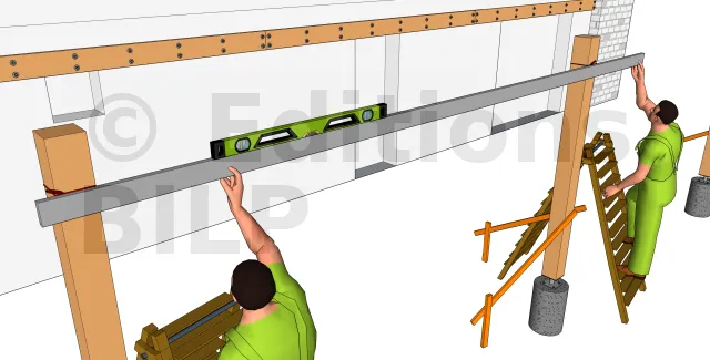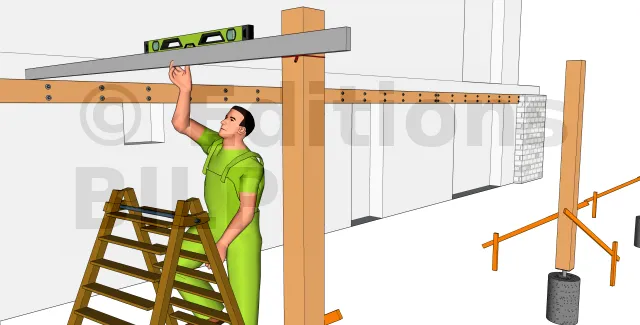 Pour ce faire, il faut placer une règle de maçon sur laquelle on met un niveau à bulle sur la poutre muralière. Par la suite, on trace le niveau inférieur de la règle et ce niveau correspondra au niveau supérieur de la poutre porteuse. De cette manière, le niveau de la poutre muralière et de la poutre porteuse seront les mêmes.