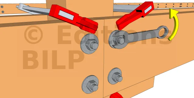 - 3 : Visser les écrous et serrer fortement. Pour l’usage d’une tige filetée, il faut contrer le serrage avec une clé de l’autre côté de l’écrou tandis qu’une autre clé sert.