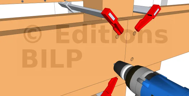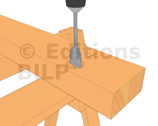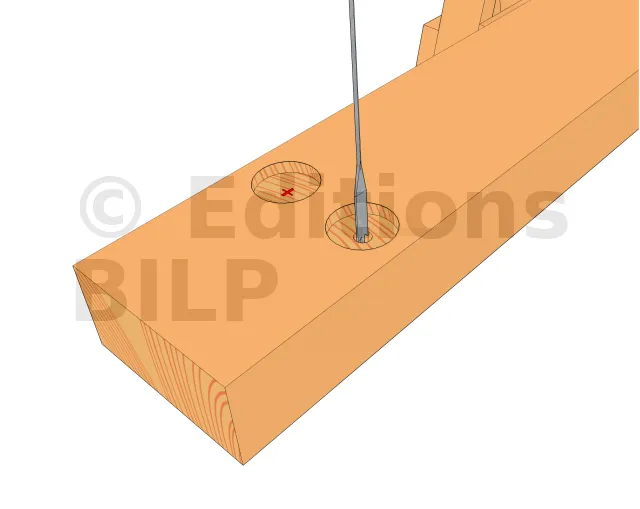 Au préalable, on prépare les poutres porteuses en pratiquant les trous servant à la fixation avec les tiges filetées. On peut réaliser de simples trous traversant mais on peut aussi compléter en réalisant un trou borgne. Il s’agit d’élargir l’orifice sur quelques centimètres, avec une mèche plate de diamètre très légèrement supérieur à celui de la rondelle d’écrou. Ainsi, ce dernier sera partiellement dissimulé. C’est une solution esthétique mais pas toujours indispensable.
