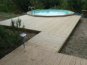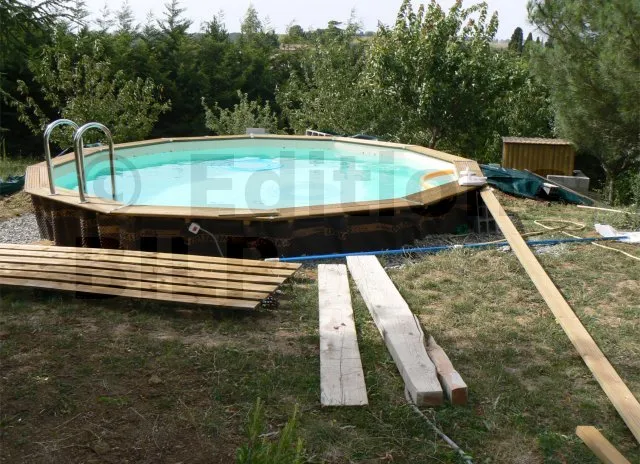 Il s’agit de la suite du projet de Stéphane (voir cet article). Le dénivelé important entre la margelle de la piscine en bois et le sol naturel, ainsi que la déclivité de ce dernier imposèrent une pose sur plots béton.
