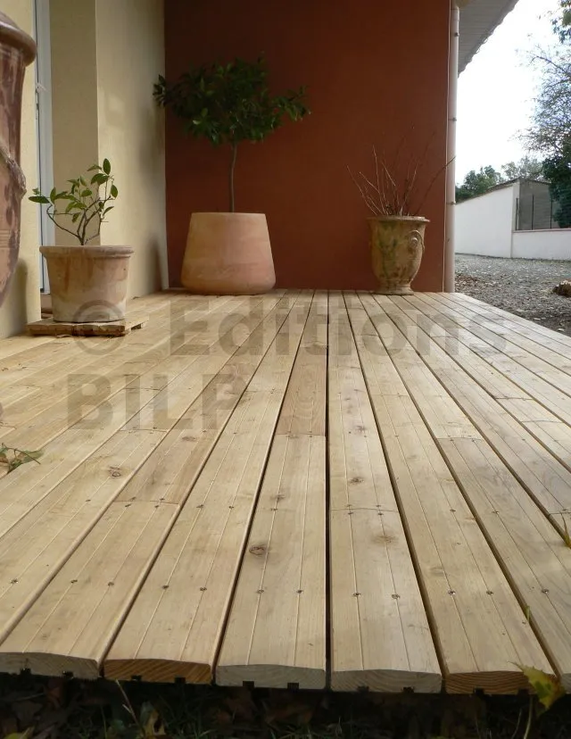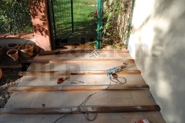 Cette terrasse en bois a été réalisée en seulement une journée de travail. Bien que la surface carrelée était en bon état, Guillaume a voulu la recouvrir avec un platelage en bois de Robinier, pour être uniforme avec l’autre terrasse qu’il venait de terminer (voir cet article).