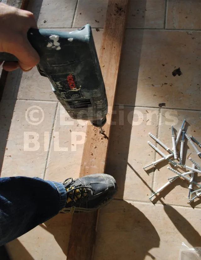 Fixation des lambourdes avec des chevilles à frapper. A l’époque, les vis MULTI-MONT TimberConnect n’existaient pas.