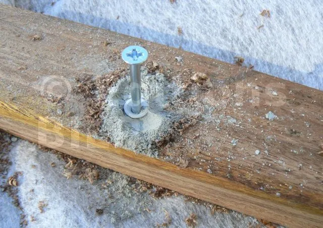 Sur les lambourdes en bois dur, il est conseillé d’usiner une petite cuvette de façon à ce que le haut de la tête de la vis se situe sous la surface de la lambourde. Ainsi, la tête de la vis ne gêne pas la fixation des lames. Pour les lambourdes en résineux, cette opération n’est pas nécessaire car la tête peut s’enfoncer dans la lambourde en bois tendre, en particulier avec les vis MULTI-MONTI TimberConnect.