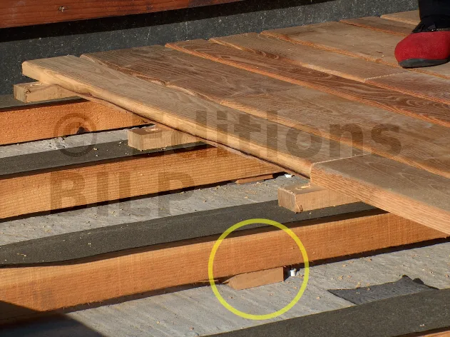 On dispose une vis aux extrémités de la lambourde plus une vis tous les un à deux mètres (X) entre les extrémités. On peut ajouter des cales complémentaires entre deux points de fixation, en les agraphant par le dessous. Il est important de mettre des cales plastique sous la lambourde pour favoriser l’aération. Cette précaution allonge significativement la durée de vie de la structure.