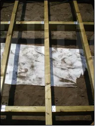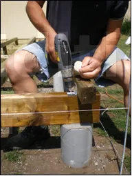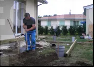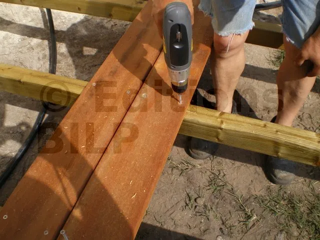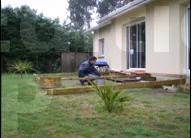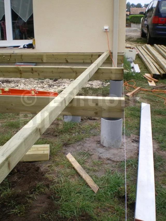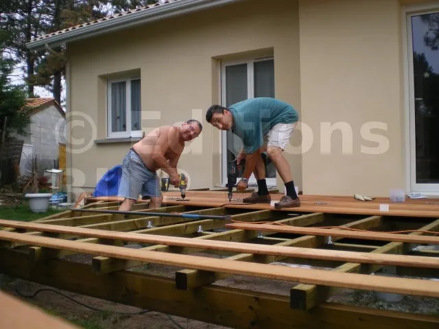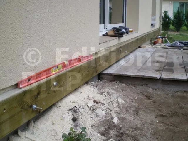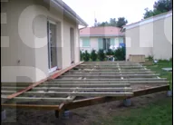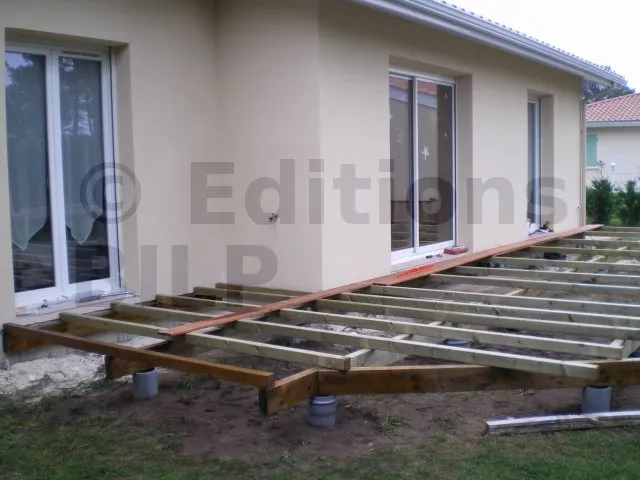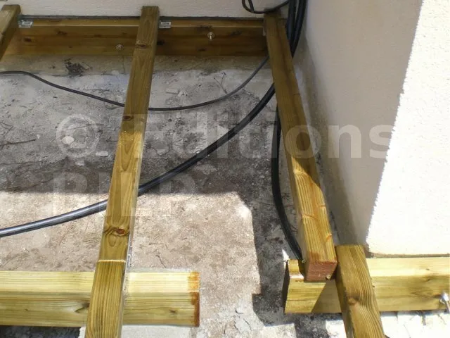 Il s’agit d’une terrasse en bois devant la baie vitrée d’un salon. La structure sur poutres porteuses a été imposée par la hauteur de 60 cm entre le seuil de la baie et le sol naturel. Il s’agit d’une configuration avec platelage parallèle au mur. Pour la fixation des poutres aux plots, Cocostef a utilisé la technique avec connecteurs scellés (voir cet article).