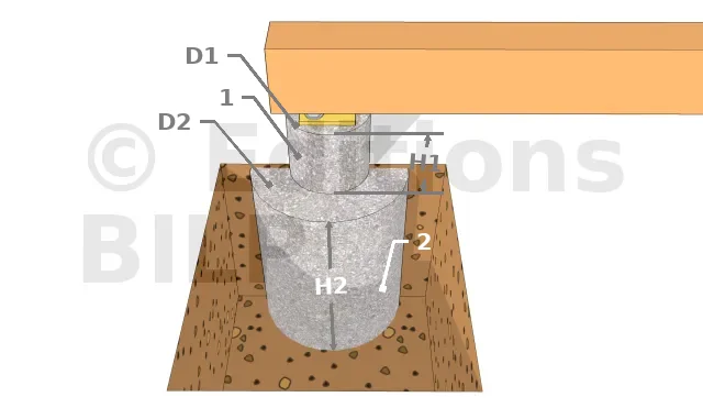 - La partie enfouie est réalisée à la tarière. Son diamètre est fonction de la nature du sol et de la charge. Il ne doit pas être inférieur à 20cm.