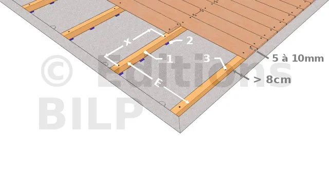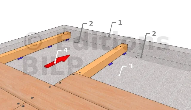 - 2 : Cales synthétiques sous lambourdes pour ménager un écart sanitaire et compenser l’horizontalité