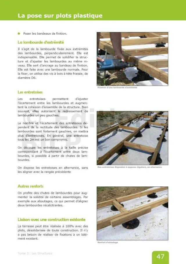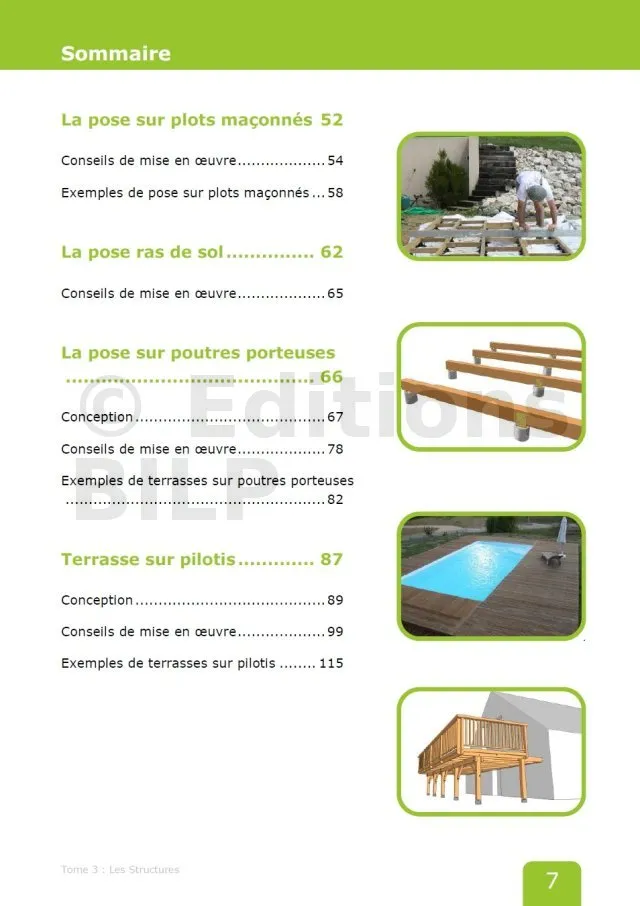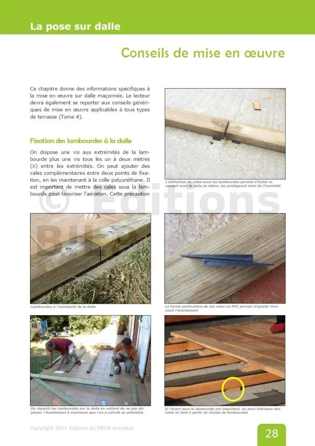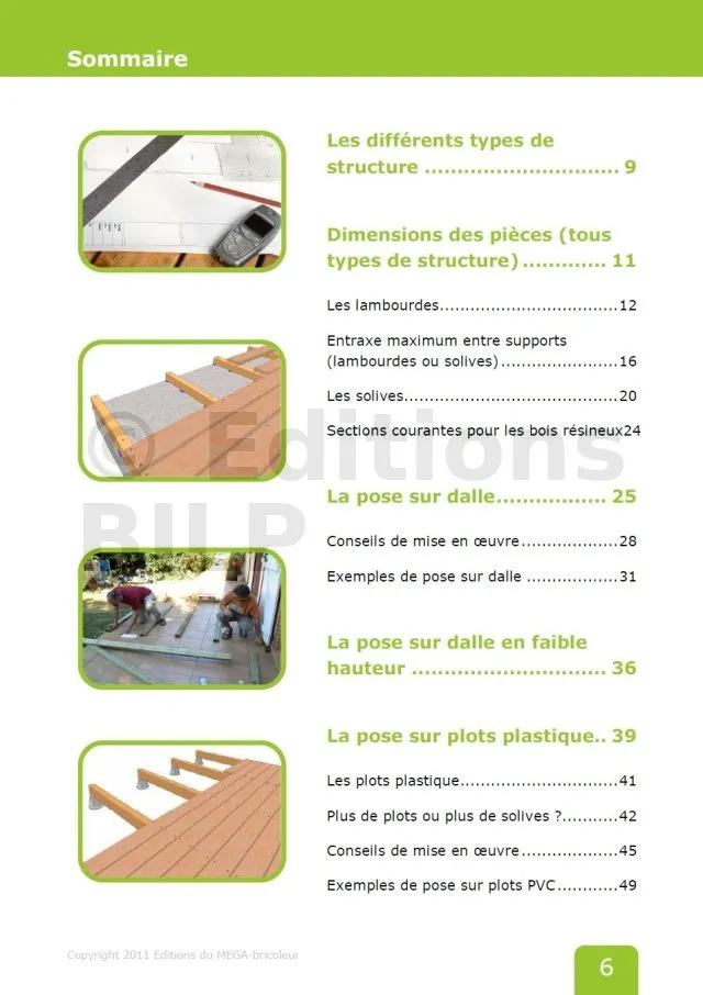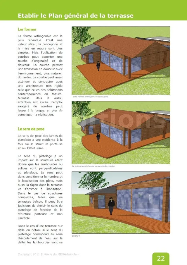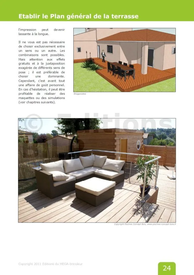 Toutes les techniques de pose et de matériels sont proposés et expliqués avec photo à l’appui. L’accés au base de calcul pour la pose plot et lambourde est très faciles et aide beaucoup pour la construction.
