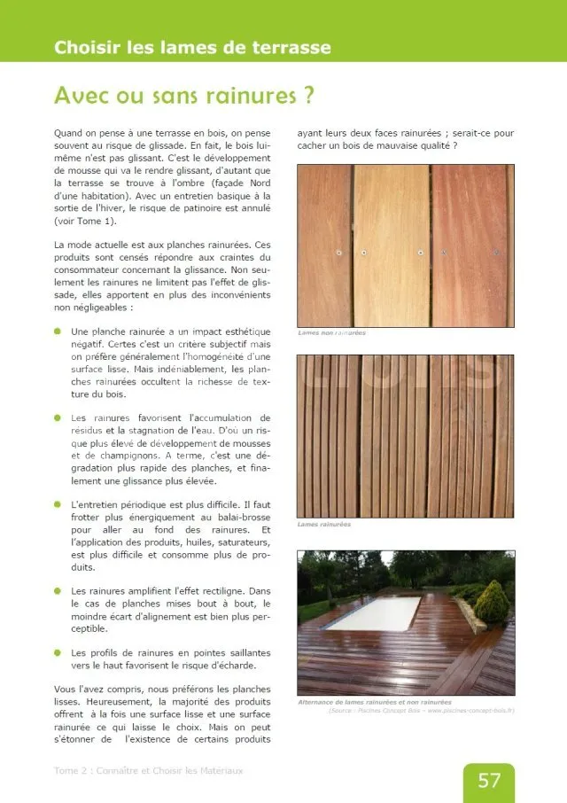 Et je vais vous donner un bon conseil : renseignez-vous sur Internet, dans les forums,etc. Mais faites attention, il se dit beaucoup de bêtises et nombreux sont ceux à les répéter. Une terrasse en bois, cela n’est pas que des planches vissées sur des lambourdes. Notre guide fait 330 pages, cela n’est pas pour rien. Et tout cela, vous allez bientôt le découvrir.