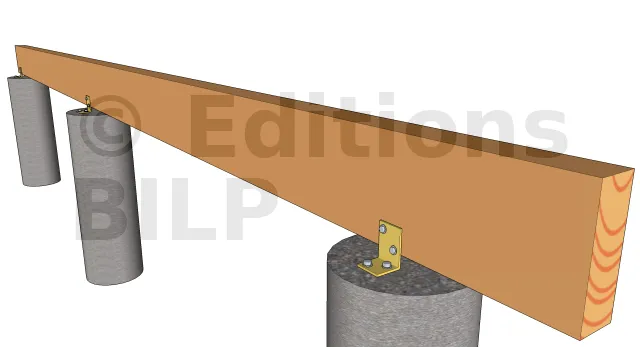 La fixation se fait par l’intermédiaire des équerres renforcées d’épaisseur 3mm. Pour ce faire, l’équerre est fixée au plot grâce à des vis d’ancrage à tête hexagonale et à la poutre porteuse avec des vis spéciales connecteurs ou un tirefond.