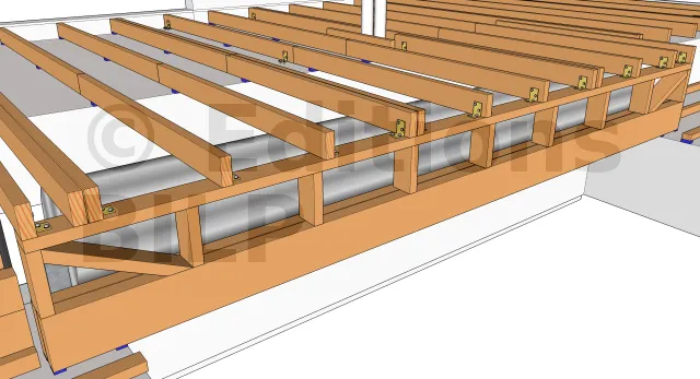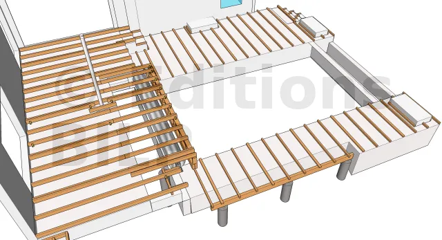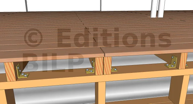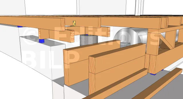 Etant donné que la largeur des solives est de 45 mm dans cette partie, il est difficile de réaliser un aboutage de deux lames au-dessus d’une seule solive. De ce fait, pour avoir un soutien efficace et un volume d’ancrage suffisant pour les lames, il a été préférable de mettre en place deux solives l’une à côté de l’autre.