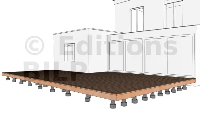 La mise en œuvre commence par la mise en place des plots en béton.Leur répartition est en fonction de la conception et des dimensions des divers éléments constituants la terrasse comme l’entraxe maximum entre les supports et la portée des lambourdes.