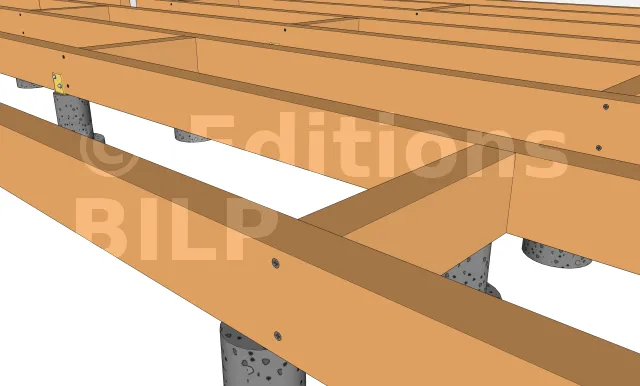 Comme pour les entretoises, les lambourdes en périphériques peuvent être fixées aux entretoises avec des équerres, des vis de renforcement type combiConnect ou des vis à tête ronde large et plate.