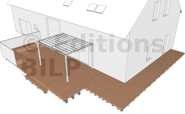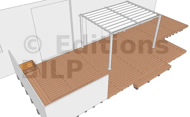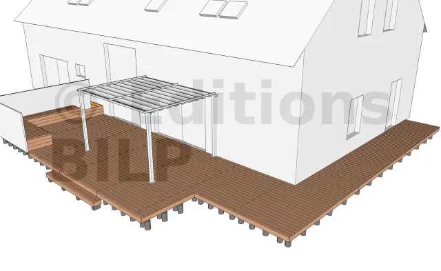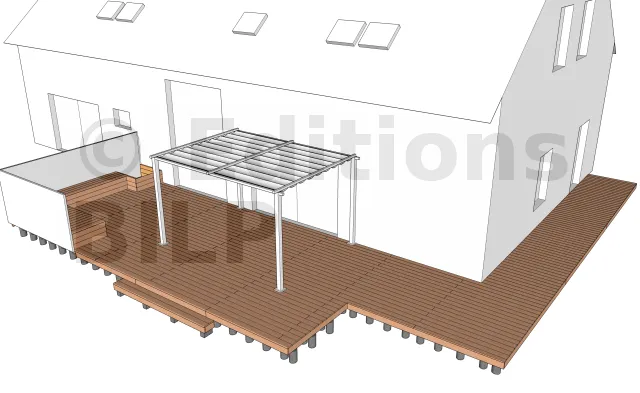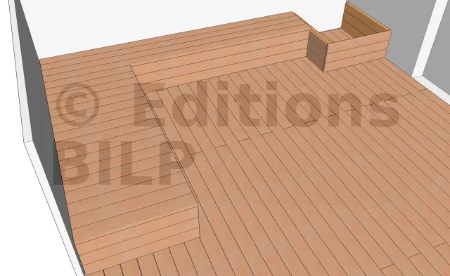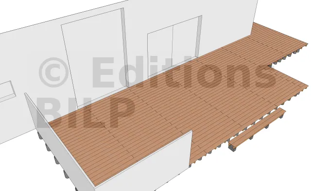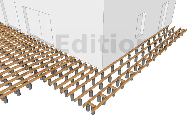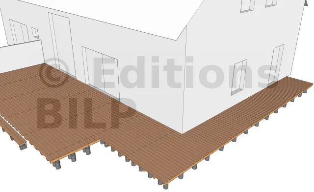 Pour l’esthétisme de la terrasse, nous avons dissimulé au maximum les plots et donné un côté aérien à la terrasse en décalant vers l’intérieur les plots périphériques d’une quinzaine de centimètres. Par la suite, des entretoises ont été mises en place au-dessus des plots pour soutenir les lambourdes à l’extrémité. Elles peuvent être fixées aux lambourdes avec des équerres, des vis de renforcement type combiConnect ou des vis à tête ronde large et plate.