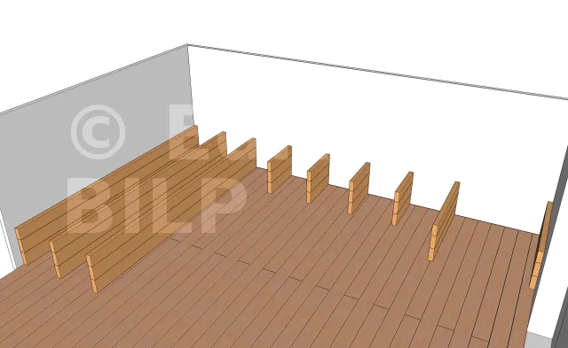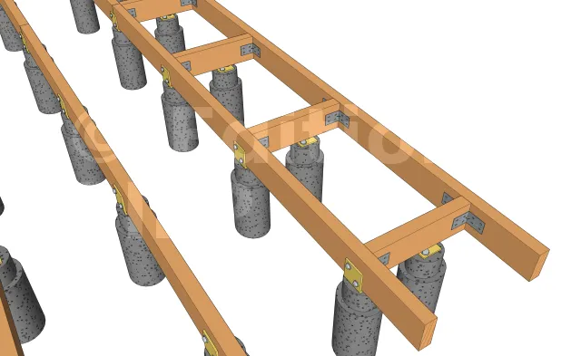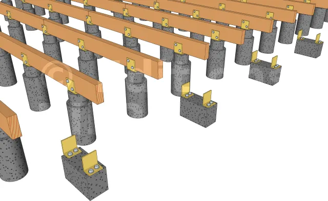 Les lambourdes pour la création de la marche des escaliers sont également fixées aux plots avec des équerres renforcées d’épaisseur 3mm que l’on fixe avec des vis d’ancrage à tête hexagonale aux plots et aux lambourdes avec des vis spéciales connecteurs ou un tirefond.