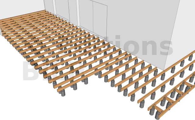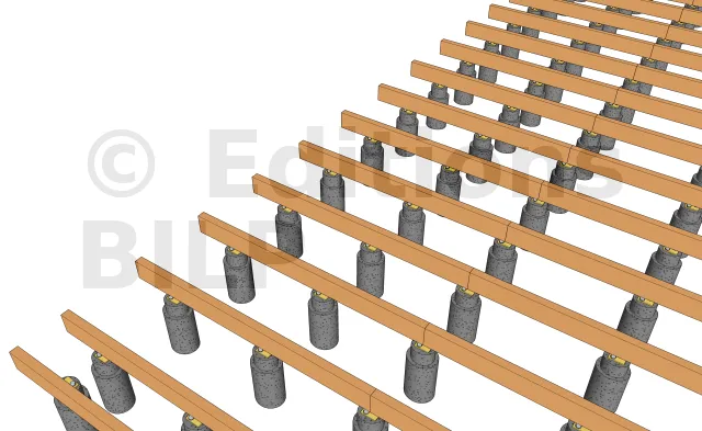 Il existe plusieurs méthodes pour la fixation des lambourdes sur les plots. Le choix de la méthode à mettre en œuvre dépend de plusieurs paramètres.Vous pouvez notamment avoir recours à des pieds de poteaux réglables vario, des chevilles à frapper en disposant quelques cales PVC sous les lambourdes.