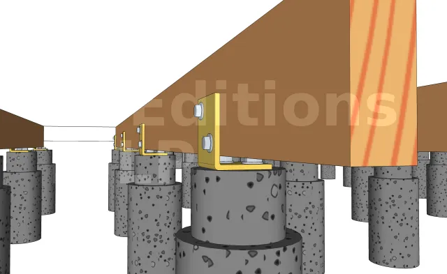 Pour ce projet, nous avons utilisé des équerres renforcées d’épaisseur 3mm. Pour ce faire, la fixation des équerres aux plots se fait avec des vis d’ancrage à tête hexagonale et aux lambourdes avec des vis spéciales connecteurs ou un tirefond.