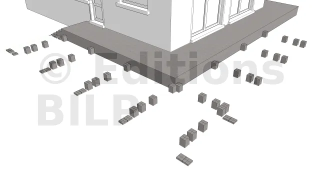 Les plots maçonnés qui serviront d’appuis pour les solives sont répartis en fonction des résultats obtenus après le dimensionnement des pièces de la terrasse notamment l’entraxe maximum entre les supports et la portée des solives.