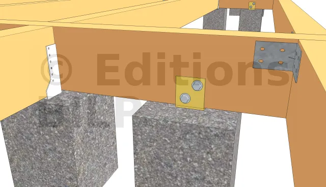 Les poutres porteuses peuvent être fixées aux plots grâce à des équerres renforcées d’épaisseur 3mm. Pour ce faire, l’équerre est fixée au plot grâce à des vis d’ancrage à tête hexagonale et à la poutre porteuse avec des vis spéciales connecteurs ou un tirefond.