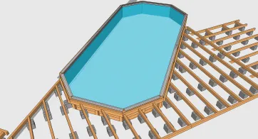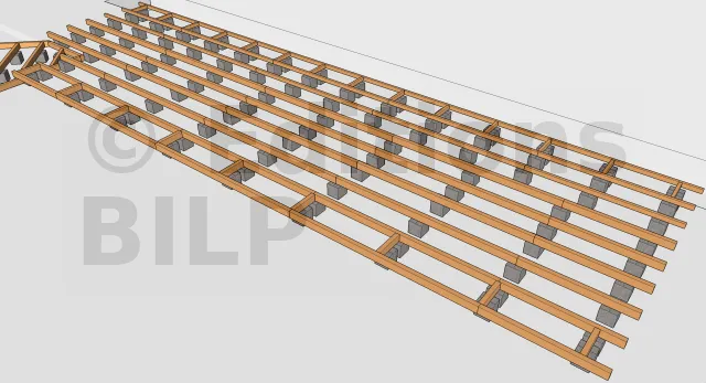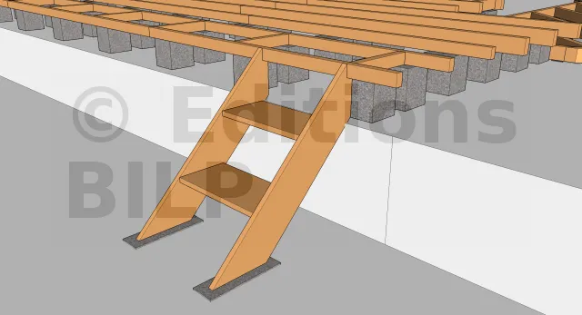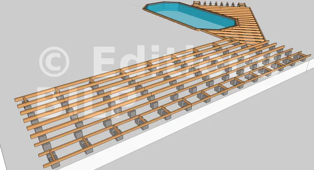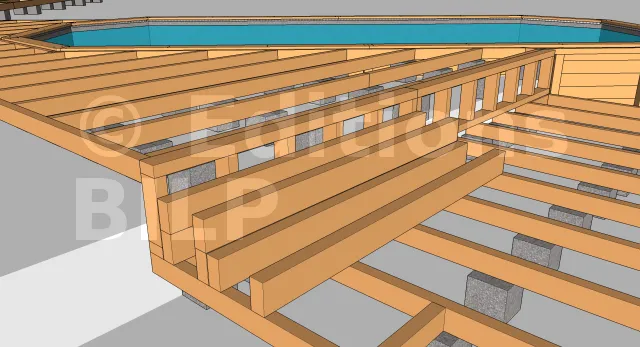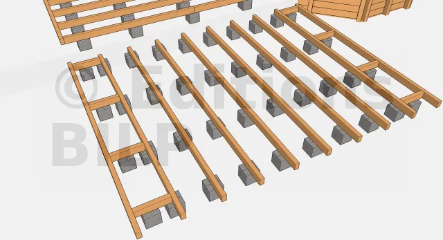 Pour un meilleur esthétisme et afin de donner un aspect aérien à la terrasse, il est important de dissimuler en tant que possible les plots périphériques en les décalant vers l’intérieur d’une vingtaine de centimètres. Au-dessus des plots, des entretoises seront mises en place pour soutenir les solives à l’extrémité. La fixation entretoise-solive est faite avec des vis de renforcement type combiConnect ou des vis à tête ronde large et plate.