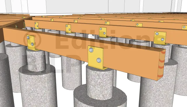 Les lambourdes dimensionnées sont fixées aux plots grâce à des équerres renforcées d’épaisseur 3mm. Pour ce faire, l’équerre est fixée aux plots avec des vis d’ancrage à tête hexagonale et aux lambourdes par l’intermédiaire des vis spéciales connecteurs ou un tirefond.