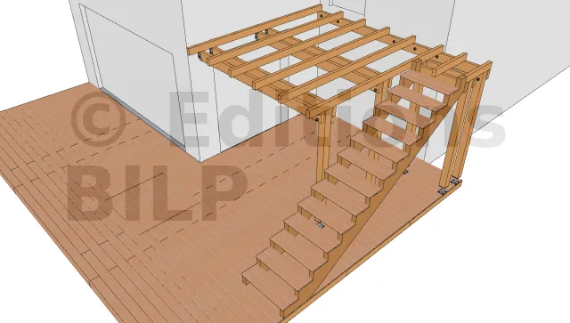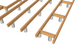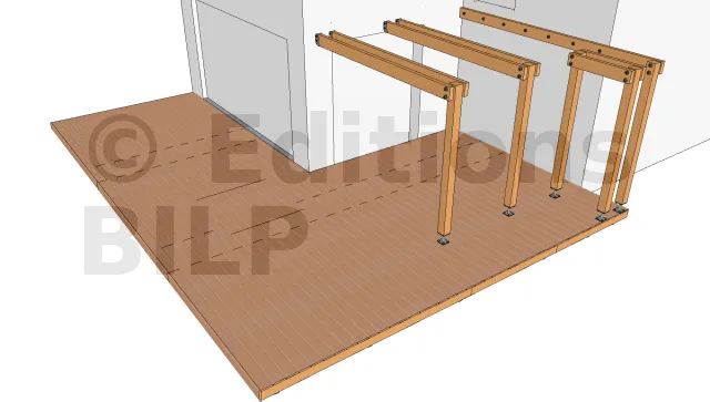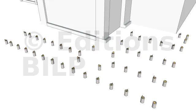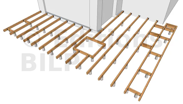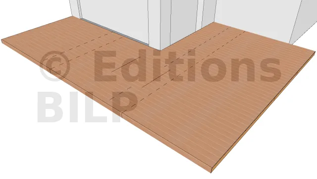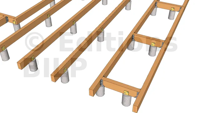 Pour dissimuler au maximum les plots et donner un côté aérien à la terrasse, il est nécessaire de décaler vers l’intérieur les plots périphériques d’une vingtaine de centimètres. Par la suite, des entretoises seront mises en place au-dessus des plots pour soutenir les solives à l’extrémité.Les entretoises sont fixées aux solives avec des vis de renforcement type combiConnect ou des vis à tête ronde large et plate.