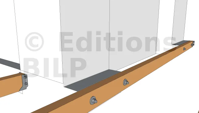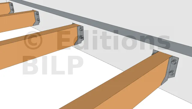 Les solives sont fixées aux plots avec des équerres renforcées d’épaisseur 3mm. L’équerre est fixée au plot avec des vis d’ancrage à tête hexagonale et à la solive avec des vis spéciales connecteur ou un tirefond.
