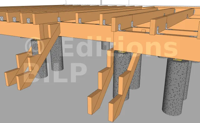 Pour ce projet en particulier, nous avons utilisé des équerres renforcées. Pour ce faire, l’équerre est fixée aux plots avec des chevilles à frapper et aux poutres porteuses avec des pointes annelées electrozinguées.