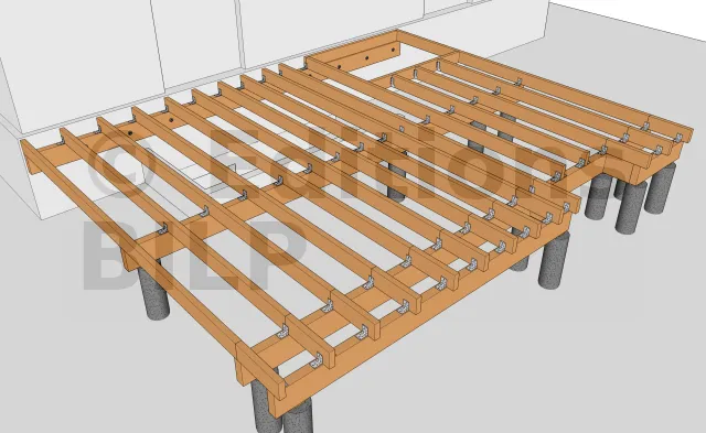 Pour la fixation des poutres porteuses sur les plots en béton, il existe plusieurs méthodes et techniques.L’une des solutions est d’avoir recours à des pieds de poteaux réglables vario qui se fixent aux plots soit par des goujons d’ancrages, soit des vis d’ancrage béton, soit par scellement chimique des tiges filetées et que l’on serre avec des écrous et des rondelles.Par contre, la fixation aux poutres porteuses se fait grâce à des pointes annelées ou des tiges filetées que l’on serre avec des écrous et des rondelles.
