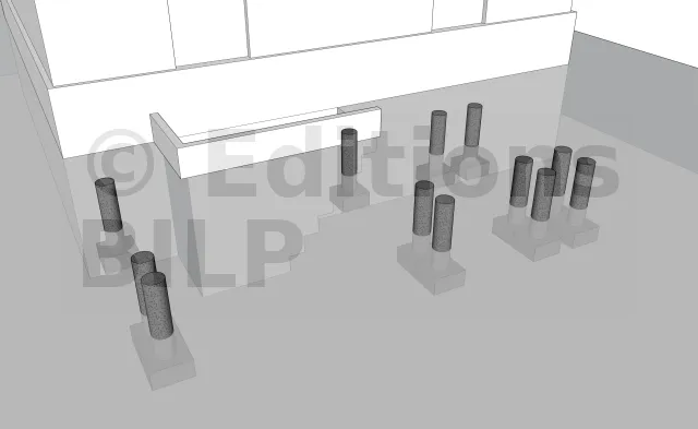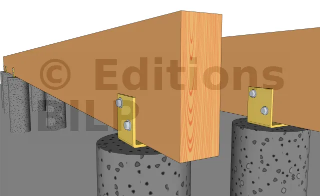 Détails des fixations des poutres porteuses sur les plots en béton