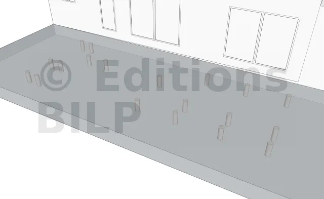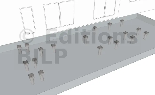 C’est au-dessus des pieux que l’on place les plots en béton.Ils sont répartis en fonction de la conception et des dimensions des divers éléments constituants la terrasse comme l’entraxe maximum entre les supports, la portée et la section des solives ainsi que la portée des poutres porteuses.