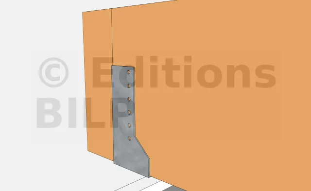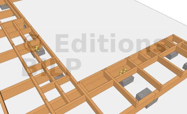 Par contre, les poutres porteuses périphériques sont fixées à la poutre muralière avec des sabots à ailes intérieures que l’on fixe également avec des pointes annelées électrozinguées ou des vis pour connecteurs tête Torx.