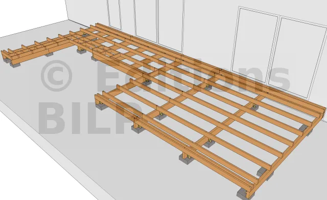 Vous pouvez également utiliser des chevilles à frapper en disposant quelques cales PVC sous les poutres porteuses, des tiges filetées que l’on scelle dans le béton encore frais avec un écrou + rondelle, des connecteurs plats métalliques ou des vis MULTI-MONTI TimberConnect que l’on fixe par le dessus.