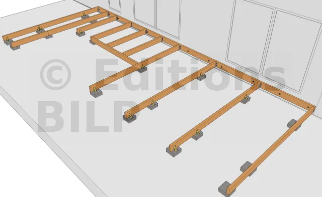 Pour la fixation des poutres porteuses sur les plots en béton, il existe plusieurs méthodes et techniques.Vous pouvez par exemple avoir recours à des pieds de poteaux réglables vario qui se fixent aux plots soit par des goujons d’ancrages, soit des vis d’ancrage béton, soit par scellement chimique des tiges filetées et par la suite les serrées avec des écrous et des rondelles.Par contre, la fixation aux poutres porteuses se fait grâce à des pointes annelées ou des tiges filetées que l’on serre avec des écrous et des rondelles.