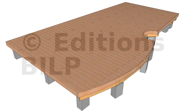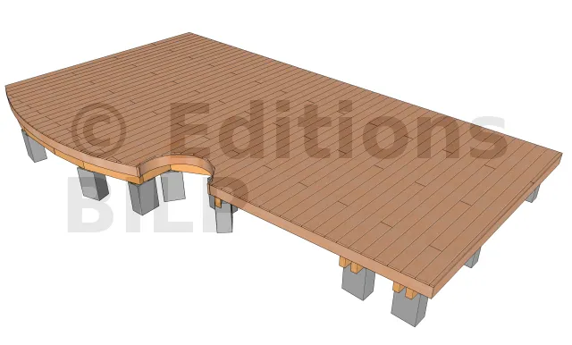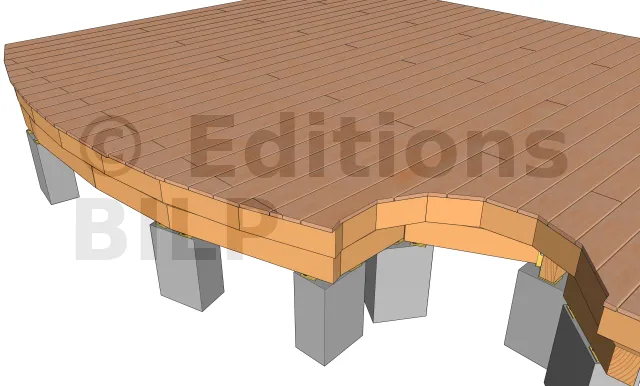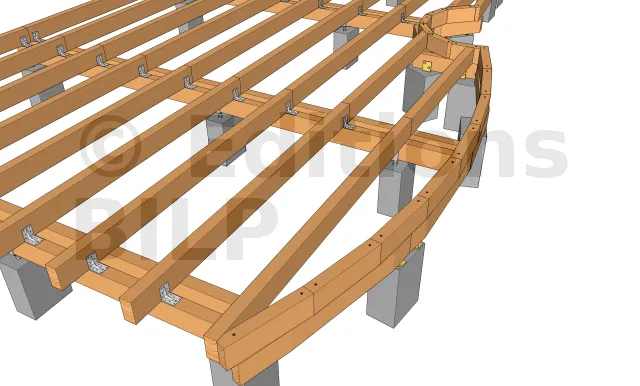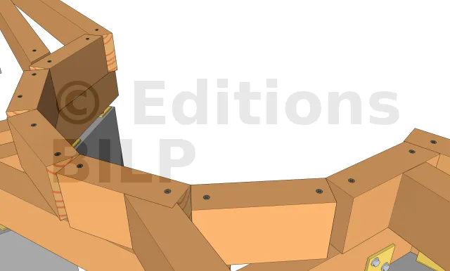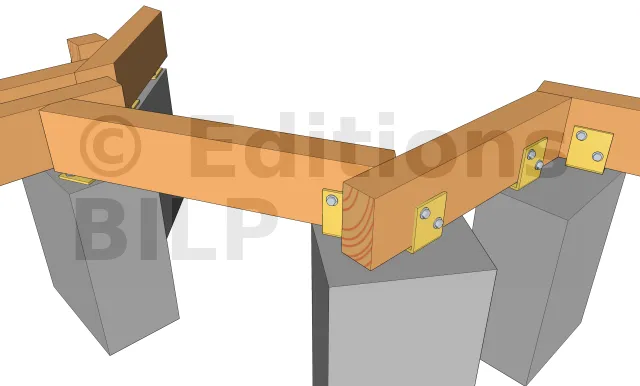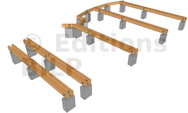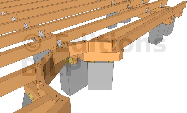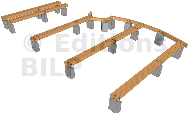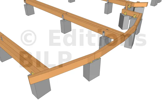 Dans le cas de ce projet, les poutres porteuses de devant permettant la réalisation des courbes ont été fixées avec des équerres renforcées d’épaisseur 3mm. Pour ce faire, l’équerre est fixée aux plots avec des vis d’ancrage à tête hexagonale et aux poutres porteuses avec des vis spéciales connecteurs ou un tirefond.