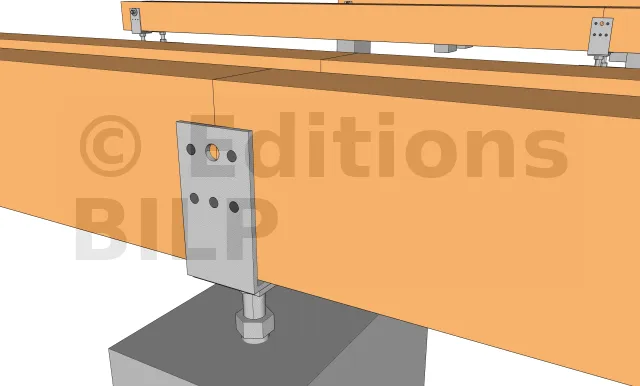 Pour la continuité de deux poutres porteuses, nous avons également eu recours à des pieds de poteaux réglables mais leur fixation aux poutres porteuses se fait avec des pointes annelées.