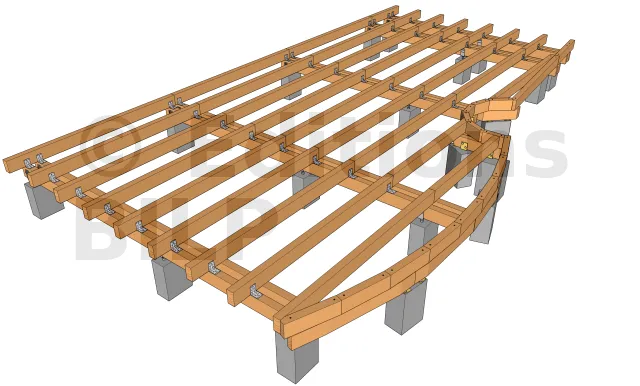 Vous pouvez avoir recours par exemple à des chevilles à frapper en disposant quelques cales PVC sous les poutres porteuses, des tiges filetées que l’on scelle dans le béton encore frais avec un écrou + rondelle, des connecteurs plats métalliques ou des vis MULTI-MONTI TimberConnect que l’on fixe par le dessus.