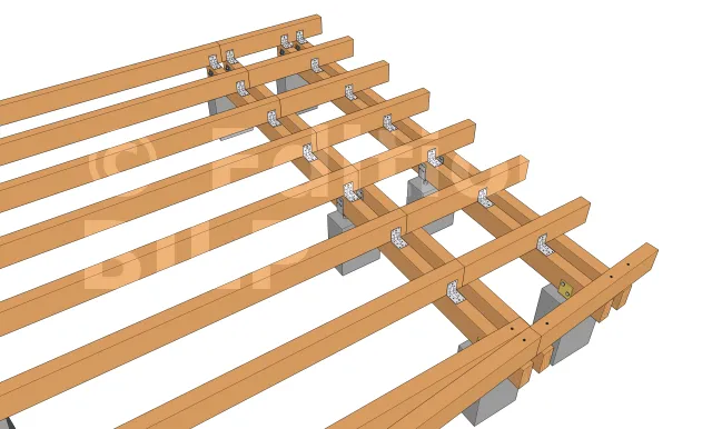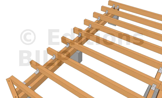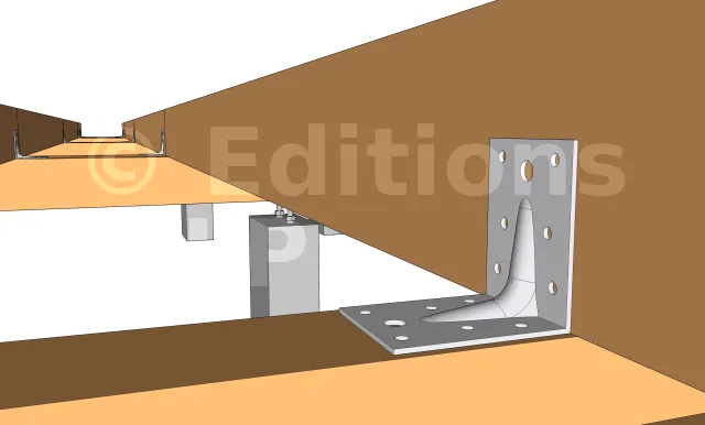La fixation des solives intérieures peut se faire avec des équerres tels que des équerres renforcées ou des équerres simples qui seront fixées avec des pointes annelées ou des vis connecteurs.