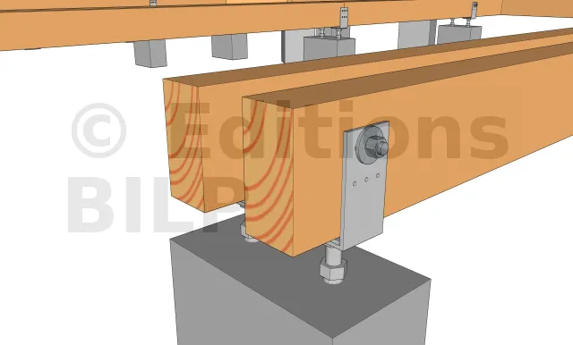 Pour les poutres porteuses perpendiculaires à l’habitation, nous avons utilisé des pieds de poteaux réglables.Ils sont fixés aux poutres porteuses avec des tiges filetées que l’on serre avec des écrous et des rondelles.