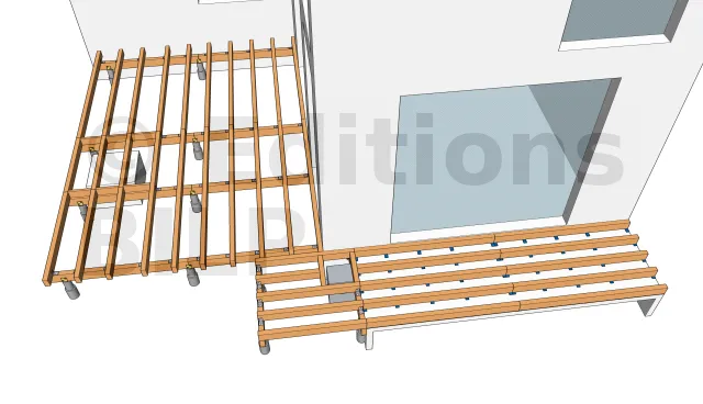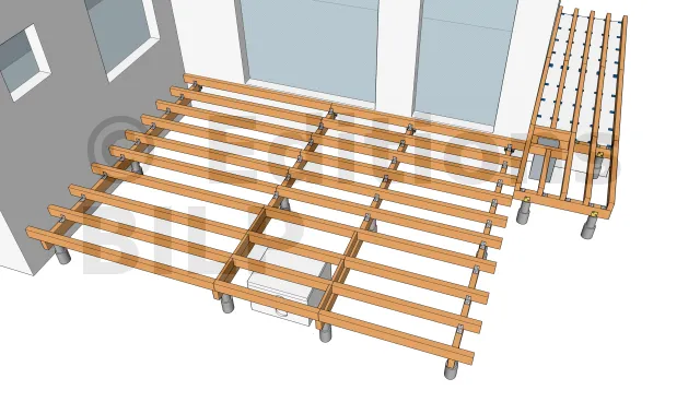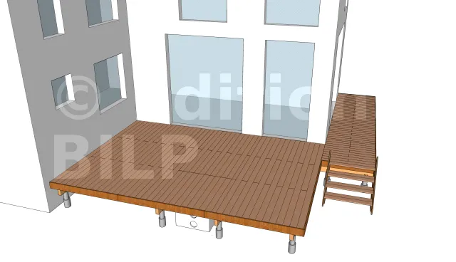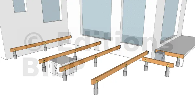 La détermination de l’emplacement des plots en béton pour l’appui des poutres porteuses s’obtient en dimensionnant les éléments de la terrasse notamment l’entraxe maximum entre les supports, la portée et la section des solives ainsi que la portée des poutres porteuses.