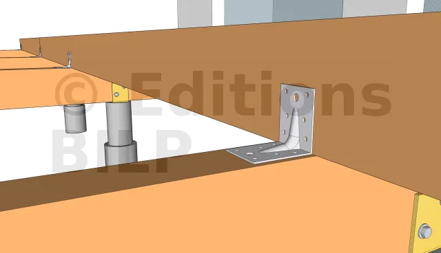 Dans le cas de ce projet en particulier, nous avons opté pour des équerres renforcées d’épaisseur 3mm. Pour ce faire, l’équerre est fixée aux plots avec des vis d’ancrage à tête hexagonale et aux poutres porteuses avec des vis spéciales connecteurs ou un tirefond.
