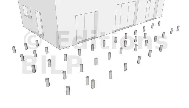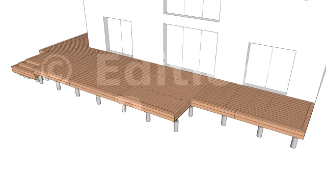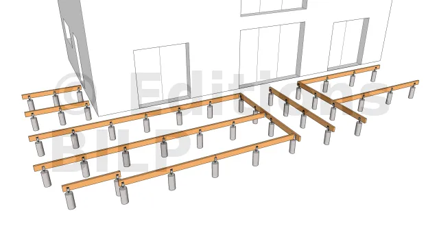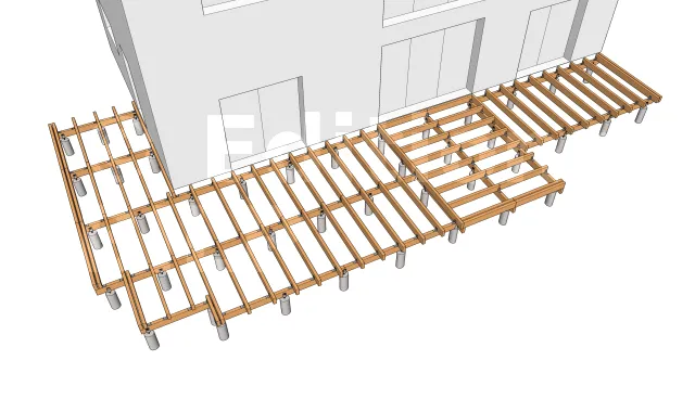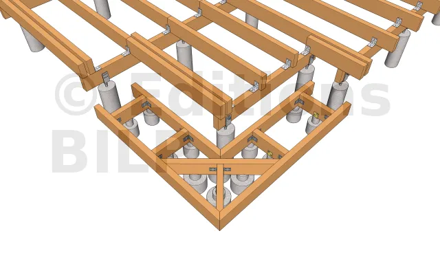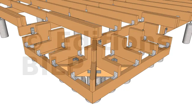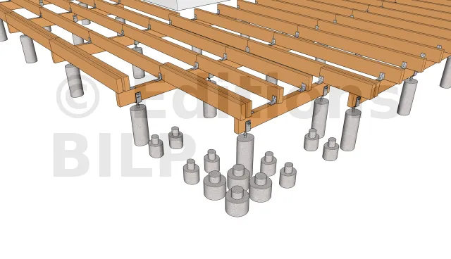 La mise en œuvre commence toujours par la mise en place des plots en béton qui serviront d’appui pour les poutres porteuses. Leur emplacement est déterminée en dimensionnant les éléments de la terrasse notamment l’entraxe maximum entre les supports, la portée et la section des solives ainsi que la portée des poutres porteuses.