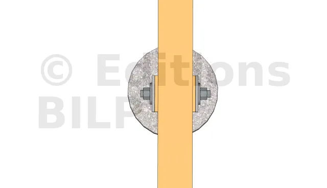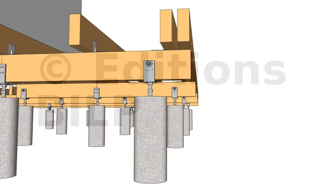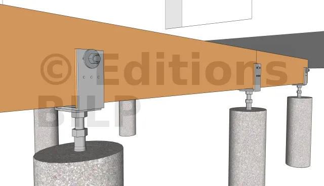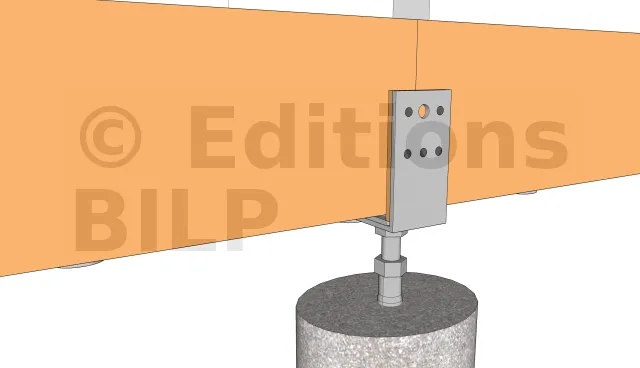 Dans notre cas, nous avons employé des pieds de poteaux réglables que l’on scelle dans le plot en béton quand le béton est encore frais.La fixation aux poutres porteuses s’est faite avec des tiges filetées que l’on serre avec des écrous et des rondelles.
