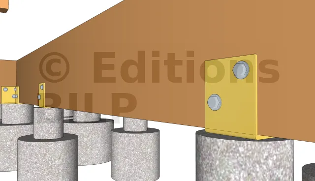 Vous pouvez avoir recours à des équerres renforcées d’épaisseur 3mm que l’on fixe aux plots avec des vis d’ancrage à tête hexagonale et aux poutres porteuses avec des vis spéciales connecteurs ou un tirefond, des chevilles à frapper en disposant quelques cales PVC sous les poutres porteuses, des tiges filetées que l’on scelle dans le béton encore frais avec un écrou + rondelle, des connecteurs plats métalliques ou des vis MULTI-MONTI TimberConnect que l’on fixe par le dessus.