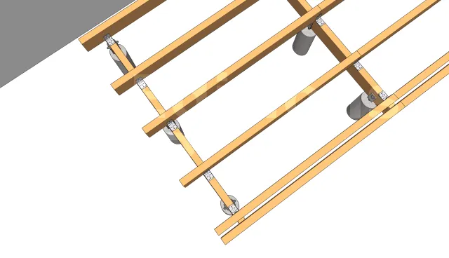 Étant donné que les pieds de poteaux réglables ont une largeur de 80 mm et que la poutre porteuse est de 63 mm de largeur, il faut y insérer des cales en bois pour combler le vide.