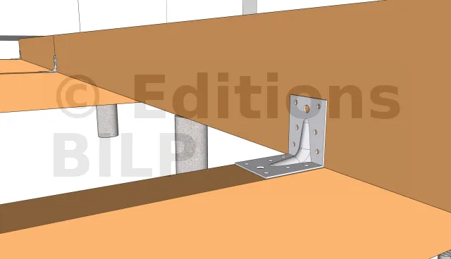Les poutres porteuses périphériques de l’escalier prennent appuies sur des entretoises. Elles peuvent être fixées par des équerres que l’on fixe par la suite par des vis ou des tirefonds.Elles peuvent être également fixées avec des vis de renforcement type combiConnect ou des vis à tête ronde large et plate.